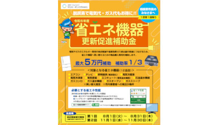 神奈川県相模原市は、家計負担の軽減や温暖化対策(温室効果ガス削減)のため、省エネ性能の高いエアコンや冷蔵庫などの購入・買い替えを支援する「省エネ機器更新促進補助金(市民用)」の第1回の事前登録を先着順で受け付けている。第1回は8月31日17時までで予算到達まで残りわずかで、第2回は11月1日9時~11月30日17時。
