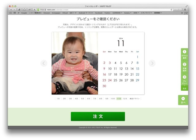 フォトブックだけでなく、卓上カレンダーの印刷サービスも始まりました。やっぱり500円で、お気に入りの写真入りのカレンダーを作ることができますよ。2014年度のカレンダーとなり、写真枚数は12点。1部ごとに送り先住所を指定できるので、プレゼントとしても最適!