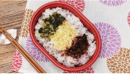 「ウインナー弁当」「ミートボール弁当」など数々の「だけ弁当」を展開しており、第8弾となる今回の「だけ弁当(漬物)」は、ゆかりを混ぜ込んだごはんの上に、3種類の漬物として「広島菜漬」「日向漬(ひなたづけ)」「安藝紫(あきむらさき)」をトッピングした。レンジで温めずに、そのまま楽しめる。