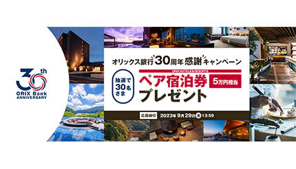 オリックス銀行は8月23日~9月29日13時59分の期間、オリックス銀行設立30周年を記念して、オリックスグループが運営するホテル・旅館の食事付きペア宿泊券(5万円相当)を、抽選で30名にプレゼントするキャンペーンを実施している。
