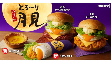 日本ケンタッキー・フライド・チキン(KFC)は8月30日に、「とろ~り月見チーズフィレバーガー」「とろ~り月見チーズ和風カツバーガー」「とろ~り月見ツイスター」を、全国のKFC店舗(一部を除く)にて数量限定で発売する。あわせて「エッグタルト」も用意。いずれも、なくなり次第終了となる。