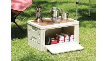 「サイドドア付きウッドトップコンテナ」は、厚さ約8mmの木製天板を取り付けた、テーブルとしても使えるコンテナ。天板に荷物を載せたまま、4面のサイドドアから物を取り出せるので、食事の際など必要になったものをその場で簡単に取り出すことができる。