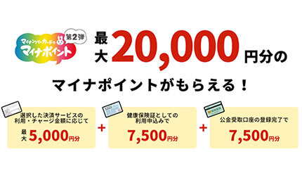 マイナポイント第2弾のうち、「健康保険証としての利用申込」「公金受取口座の登録」を条件とした合計1万5000円(7500円×2)相当のマイナポイントは、買い物なしに手順に沿って申し込むだけで付与される。