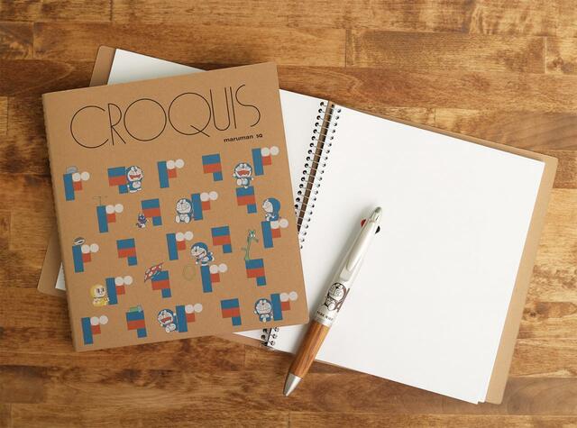 そのほか、外側は茶色の布貼り、ふたを開けると内側にドラえもんのイラストが満載の「ガジェットボックス」や、マルマンの「クロッキーブック」のドラえもんバージョンなど、気になるグッズが登場です。