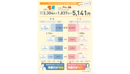 調査対象者に、洋服代とその他のファッションアイテムにかけるお金について質問し、その結果から1カ月あたりの洋服代の平均を算出したところ、調査対象全体での月平均額は5141円だった。