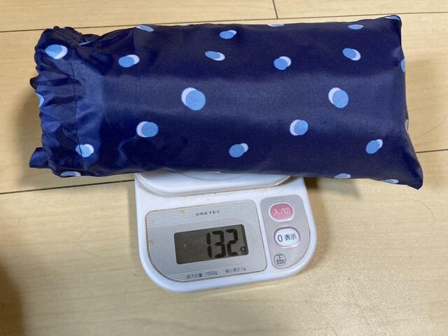 スリコの「バイカラーレインポンチョ」は200g(収納袋含む)、ファッションセンターしまむらの「Ladies レインコート」は132g(収納袋含む)でした。