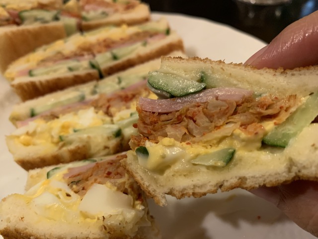 パンはトーストされ、さっくり。きゅうりはパリパリ!キムチは程よい酸味、たまごフィリングのマヨネーズと相まって、食べたことのない味わいにシビレました!