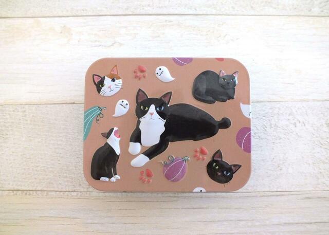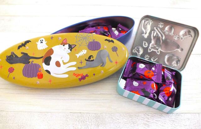 続いて、ハロウィンにぴったりな、ネコデザイン缶2点のご紹介です。黒ネコ以外のネコもたくさん登場しますよ。