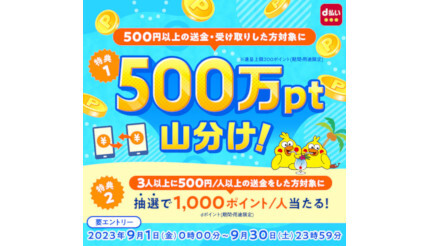 リニューアルを記念して、「500万ポイント山分け!d払い送金ご利用でdポイントが必ずもらえる!3人以上送金したら更に1,000ポイント当たる!キャンペーン」を、9月1日0時から30日23時59分まで開催する。
