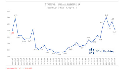 全国の家電量販店やネットショップからデジタル家電などの実売データを収集・集計している「BCNランキング」を使って、20年8月の音声翻訳機の販売規模を基点とした指数推移をみると、21~22年はおおよそ0.4~0.6の指数で推移している。平たく言えば「20年8月の販売規模よりも、21~22年各月は4~6割も市場規模が減っている」ことを意味している。