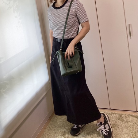 足首の上まで隠れる長めのスカート丈で、こなれた雰囲気を演出できます。