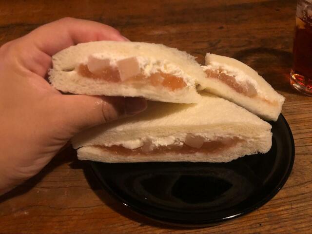 パインやキウイ、みかん、黄桃それぞれの酸味や甘味が口の中に広がります。くどさもなくパクパク食べられる4種のフルーツサンド。