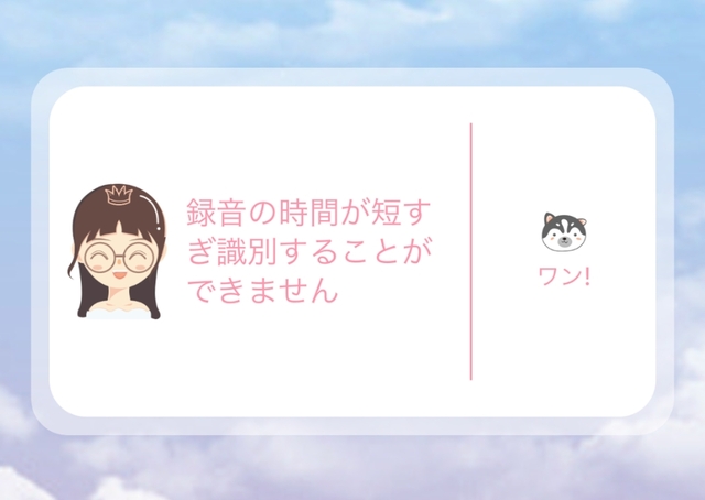 録音ボタンを長押しすると、すぐに犬語に変換してくれます。「大好きだよー」は犬語では「ワンワン、クーン、ワンワン、ワンワン」のようです。日本語よりも随分と長くなっていますが、甘えたような鳴き声がとってもかわいい!