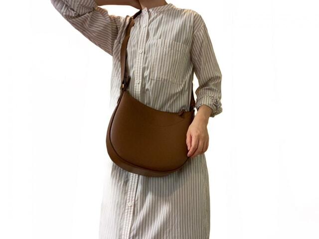 2つ目は秋に着たいシャツワンピースと合わせたゆるっとカジュアルスタイル。シャツワンピのストライプにはブラウンが使われているので、バッグの色とのバランスが簡単にとれました。