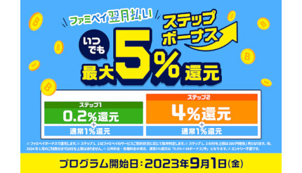 「ファミペイ翌月払い ステップボーナス」は、ファミペイのサービス契約・登録状況によって、「ファミペイ翌月払い」で支払ったすべての利用に対するファミペイボーナスの付与率を最大5%(通常還元分0.5%+ファミペイ翌月払い利用特典0.5%+ステップボーナス0.2%または4.0%)とするボーナス還元プログラム。1カ月あたりのファミペイボーナスの付与上限は500円相当だが、プログラムの開始を記念して、2024年1月利用分までは上限なしで還元する。