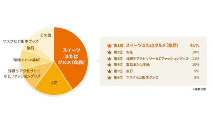調査対象者に、これまで敬老の日にもらってうれしかったプレゼントを尋ねたところ、「スイーツまたはグルメ」がもっとも多く、「お花」がそれに続いており、洋服やアクセサリーといった形に残るものよりも「消えもの」が上位となった。