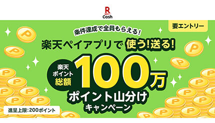 期間中にエントリーした上で、「楽天ペイ(アプリ決済)」のコード・QR・セルフ払いで税込100円以上を支払うとともに、「楽天ペイ(アプリ決済)」の残高としても利用可能なオンライン電子マネー「楽天キャッシュ」を、税込100円以上を本人以外に送付した人全員に100万ポイントの楽天ポイント(期間限定ポイント)を山分けでプレゼントする。進呈上限は200ポイント。