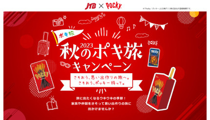 JTBは、江崎グリコの「ポッキー」ブランドとタイアップし、「2023秋のポキ旅キャンペーン」を9月14日に開始する。2~5月に実施した「2023春のポキ旅キャンペーン」に続き、今秋に実施するキャンペーンは10月1日~12月29日の宿泊を対象にエリアを関西から全国に拡大する。
