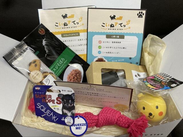 「こいぬすてっぷ」は、獣医師監修で生後2ヵ月~1歳までの愛犬向けに、しつけ・育て方を学べる本とおもちゃやおやつ、日用品が毎月届くサービス。
