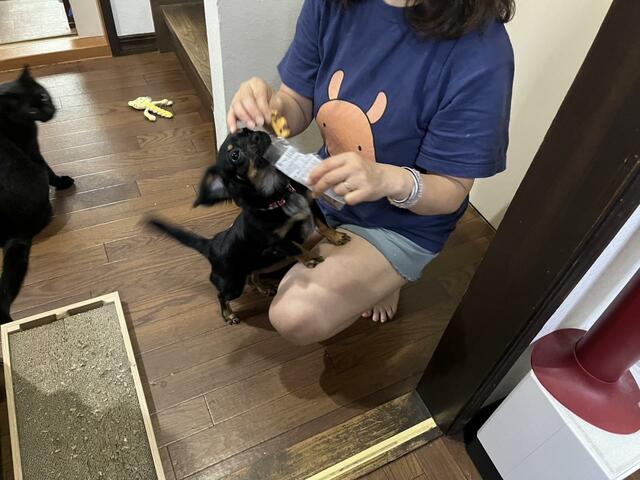 そのままの大きさで渡してしまうと子犬や小型犬は誤飲の危険性があるので割ってあげました。