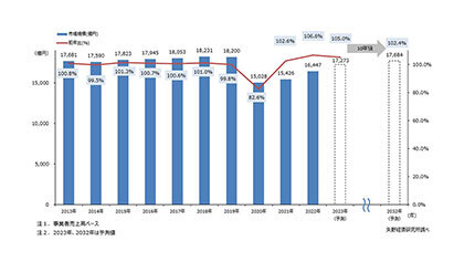 矢野経済研究所は、2023年の葬祭ビジネス市場規模(事業者売上高ベース)を、前年比105.0%の1兆7273億円と予測するとともに、10年後の2032年は2023年比で102.4%となる1兆7684億円と予測している。