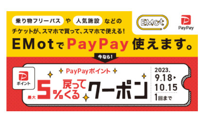 小田急電鉄は、同社が提供するMaaSアプリ「EMot」とデジタルチケット購入サイト「EMotオンラインチケット」で、9月12日から、スマートフォン決済サービス「PayPay」に対応した。また、9月18日から10月15日まで、アプリ・サイトで販売中の全チケットを対象に、チケット代金の最大5%のPayPayポイントが戻ってくるPayPayクーポンを配信するキャンペーンを実施する。