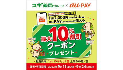 au PAYは、「au PAYアプリ」内で、スギ薬局グループの対象店舗で1回税込2000円以上(スギ薬局クーポン割引後、スギポイント支払金額・スギお買物券利用金額を除く)を「au PAY(コード支払い)」で支払うとその場で最大10%割り引くクーポンを配信している。クーポン配信・獲得・利用は9月24日まで。1au IDあたり1回まで獲得でき、割引上限は500円。