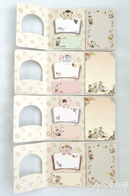 ダッフィー:淡いグリーン、シェリーメイ:クリームイエロー、ジェラトーニ:ベージュ、リーナ・ベル:ラベンダー色の絵本型台紙。