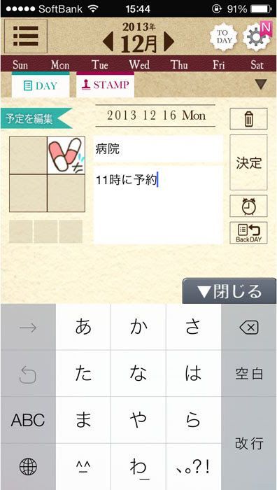 なんといっても可愛いのが、予定をスタンプで表示できちゃうところ。数十種類もある中からお気に入りや用件に合ったスタンプを選択して、日付部分までもっていくドロップ。あとは「予定を編集」をタップし、用件や時間などを入力すれば、予定もしっかり管理できちゃいます。