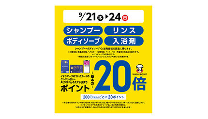 イオンは9月21~24日の期間限定で、シャンプー、リンス、ボディソープ、入浴剤を購入する際にイオンマークのついたカードのクレジット払いやAEON Payのスマホ決済で支払うと、WAON POINTが基本の20倍(200円ごとに20ポイント)になるキャンペーンを実施する。