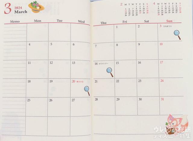 ダッフィーたちの姿は右下に、左ページの各月の横に関連小物のイラスト、祝日やバレンタインデー、クリスマスイブなど大切な日にお印。