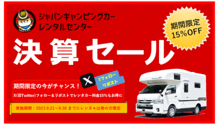 同セールの適用を受けるには、ウェブでの予約時にクーポンコードとして「決算セール2023」を記載するとともに、X上で「ジャパンキャンピングカーレンタルセンター」の公式Xアカウント(@JAPANCRC)をフォローして、同キャンペーンに関する投稿をリポストする必要がある。