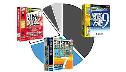 では、具体的にどのような製品が売れていたのだろうか。上位10製品には、SSIトリスタ―の「携帯万能」シリーズ、ソースネクストの「携快電話」シリーズ、ジャングルの「携帯マスター」シリーズ、インクリメントPの「ケータイ・エディ」シリーズが入った。当時のガラケーの通信方式に伴い、携帯電話ソフトもPDC用、cdmaOne用というように対応機種が分かれていた。製品別で首位になった「携帯万能9」は、アップグレード ケーブルレス版、PDC用USBモデムケーブル付、PDC用充電機能付USBモデムケーブル版、cdmaOne用USBモデムケーブル付、cdmaOne用充電機能付USBモデムケーブル版と5種類も存在し、買う方も混乱の極みに達するようなラインアップだ。