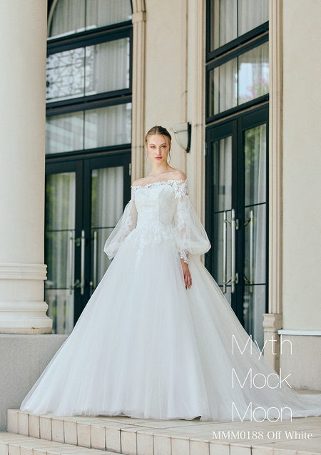 エアリー感あふれる長袖のパフスリーブと、たっぷりのトレーンで、まるで絵画のようなバックスタイルに。