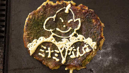 大阪・ミナミのお好み焼き屋『おかる』の名物マヨアート。通常、絵柄はお任せ。