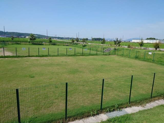ドッグランはエリア分けのない一面フィールドタイプ。サイズは小さめですが、すぐ隣に「塩谷古墳公園」があるので、古墳を見ながらのんびりとお散歩もできます。