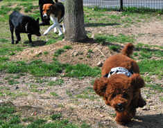 周辺を桜の木に囲まれた約380平方メートルのドッグランは、エリア分けのない一面フィールドタイプ。奥にむかってなだらかに傾斜して上がっています。