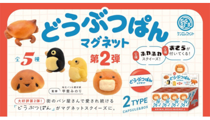 ケンエレファントは10月下旬に、地元パン愛好家である甲斐みのりさんの監修による、マグネットスクイーズ「どうぶつぱんマグネット 第2弾」を発売する。価格は、カプセルトイが1個400円、ブラインドBOXが1個440円。同社の公式オンラインショップ「ケンエレストア」では、ブラインドBOX6個セットの予約を受け付けている。