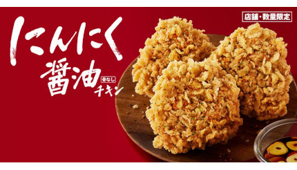 ラインアップは、「にんにく醬油チキン」(単品、320円)、オリジナルチキン、ポテト(S)、ドリンク(M)をセットにした「にんにく醬油チキンセット」(910円)、にんにく醬油チキン×2ポース、オリジナルチキン×2ピース、選べるサイドメニュー×1個をセットにした「食べくらべ4ピースパック」(1350円)、にんにく醬油チキン×3ポース、オリジナルチキン×3ピース、選べるサイドメニュー×2個をセットにした「食べくらべ6ピースパック」(1950円)を用意する。