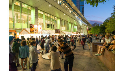 「大江戸ビール祭り2023秋」の会場となる品川インターシティS&R棟前は、JR品川駅港南口から屋根付きの歩道橋で直結しており、屋内に飲食エリアも用意しているので雨天でも安心だ。