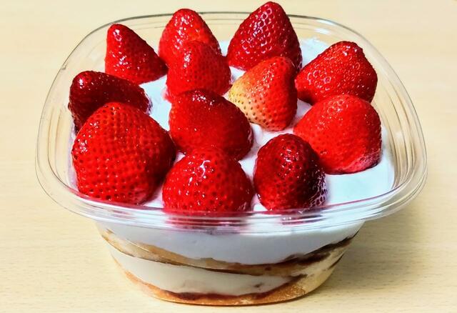 本品は「めっちゃ甘いけど、おいしかった!」「クリームたっぷりで、ほぼ飲み物」など、SNSで話題の商品。てっぺんのナパージュでコーティングされたイチゴの下には、生クリームやカスタードクリーム、イチゴソースなどが層を成しています。