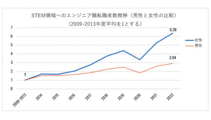 同分析によれば、STEM領域への女性の転職数は約10年で6.38倍に増加しており、男性の転職数の増加率(2.94倍)と比較しても、大きく増えていることが明らかになった。