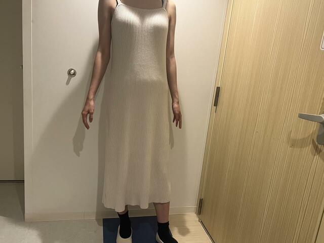 まずはシンプルにキャミワンピース単体で。身体のラインを拾いすぎないので、セクシーになりすぎず着られます。