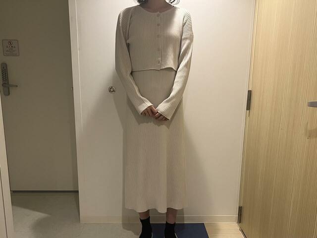 カーディガンのボタンを外して着用すると、ボタンを留めた時に比べて肌がチラッと見え、またワンピースのピタッと感とカーディガンのゆるさで抜け感を演出できますよ。