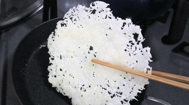 3分ほどで餅同士がくっつき、ジュッと揚げ焼き状態に。箸でつまむと立ち上がり、1枚のせんべいになりました。
