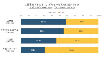調査結果によれば、Z世代の転職志向は「(いずれ)転職したい」が58.4%に達しており、他の世代と比較してもっとも高い割合となっている。