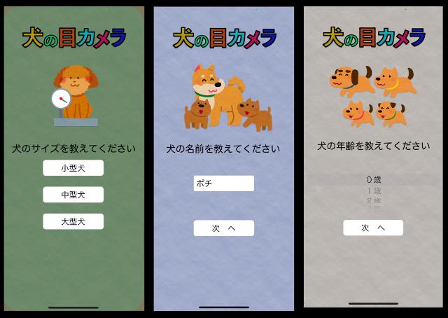 アプリをインストールすると、愛犬の設定画面がでてきます。はじめに名前を入力し、犬種(小型犬・中型犬・大型犬から選択)します。