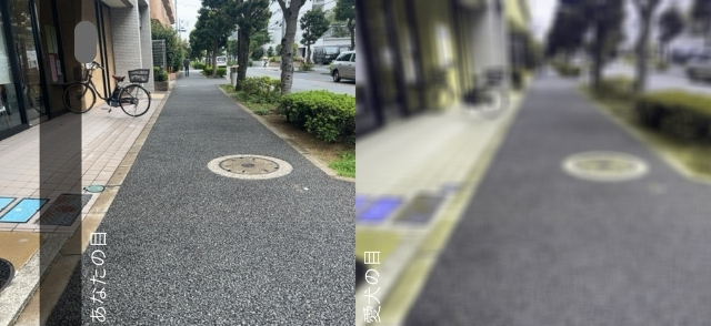 写真だけでなく動画も撮影できるので、実際に動いてみるとますます見えにくさを感じます。それにしても、毎日こんなに見えない中でちゃんと歩いていたのかとビックリしました。