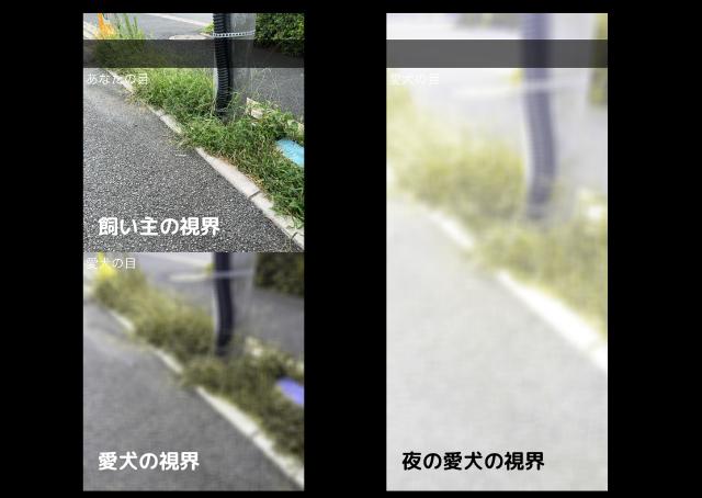「犬の目カメラ」では、夜になるとどう見えるかもシミュレーションできます。同じ道を犬の目で見ると、夜はほとんど見えていないことがわかりました。