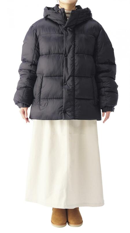 下部分はファスナーで着脱できるので、ロング丈にもレギュラー丈にもなり、ひざ掛けにもなるボリュームアウターです。耐久撥水加工付き。